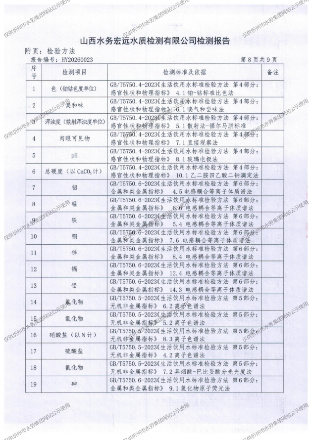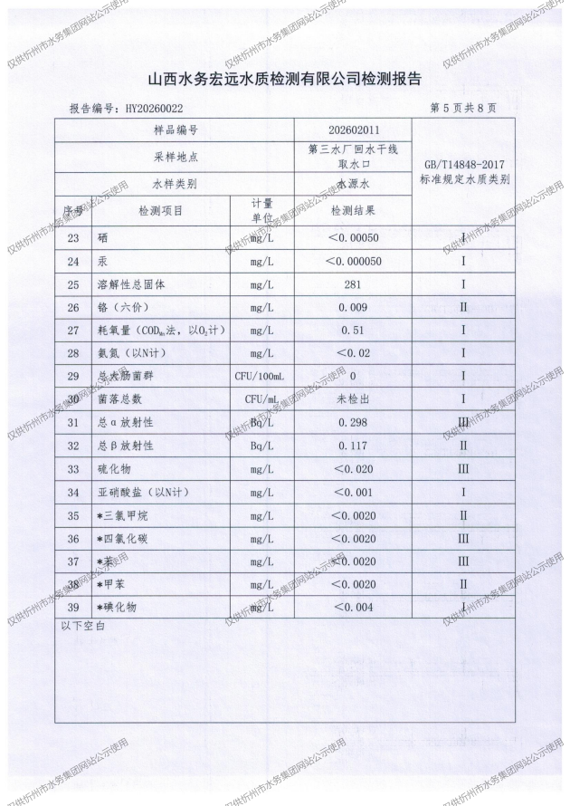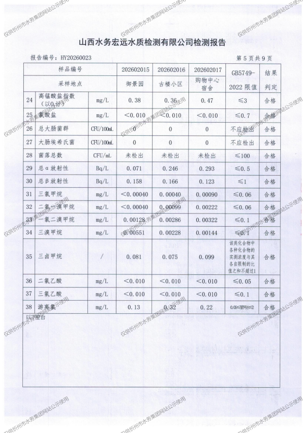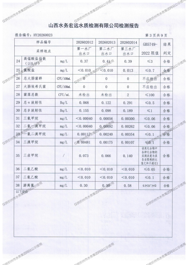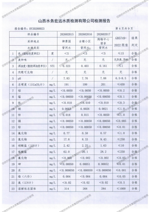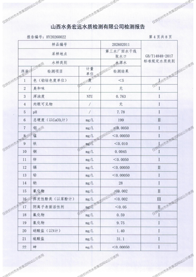忻州城區(qū)公共供水水源水、出廠水、管網(wǎng)水、管網(wǎng)末梢水2026年2月份水質信息公示