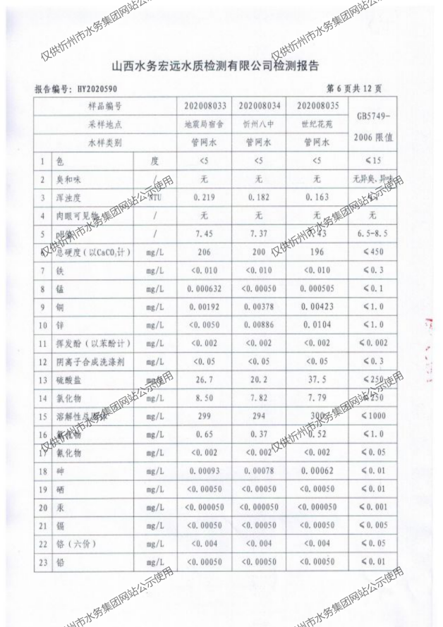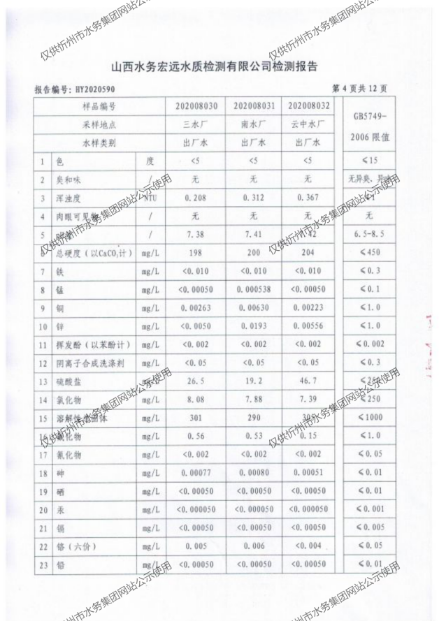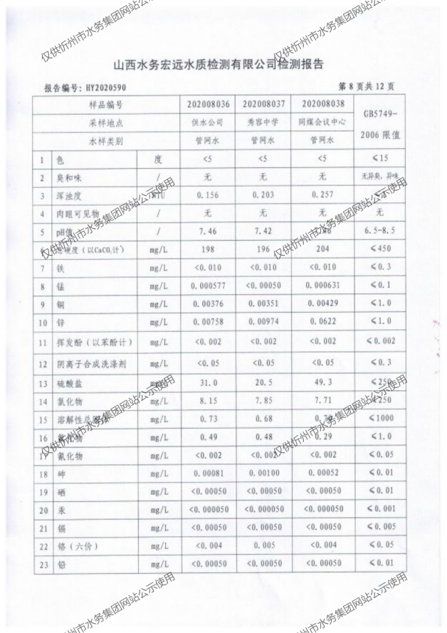 忻州城區(qū)公共供水水源水、出廠水、管網水、管網末梢水2020年8月份水質信息公示